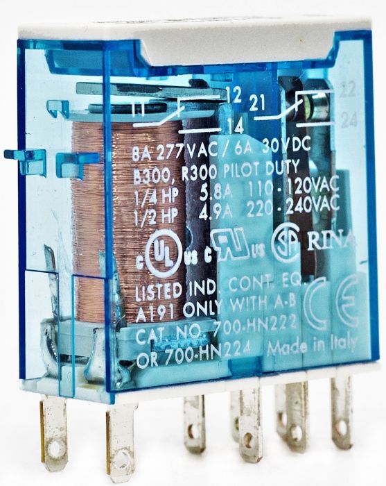 Allen-Bradley 700-HK32Z24-4 Bulletin 700-HK Slim Line Style Relay, General Purpose, DPDT, 240V AC 10A Contact Rating, 8A Contact, 24V DC, Pilot Light, Series A. |
